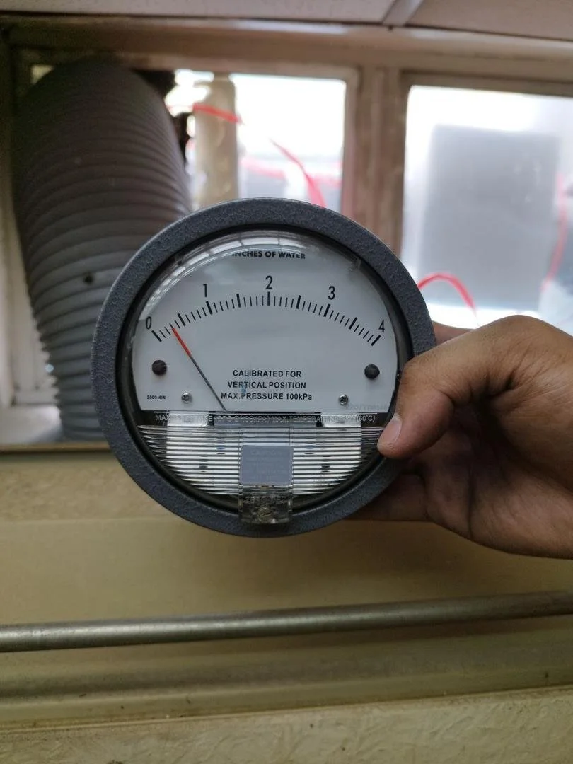 Hood flow rate recording needs velocity pressure reading taken at least at 5 times diameter from the hood connection to the duct. Most of the time this point will not be available due to short connection spools or ending up with provision of sampling point at inaccessible areas on top of the ceiling. This is where the static pressure can be used as the substitute . Recording of static pressure does not require many traverse and can be taken at a location of two times diameter. The baseline static pressure reading can be taken upon proper testing and balancing exercise setting adequate flow rate for the hood to churn the right capture velocity or air changes. The hood static pressure can’t be taken daily to ensure there is adequate hood flow rate before any operation especially for the ones dealing with hazardous airborne chemicals.